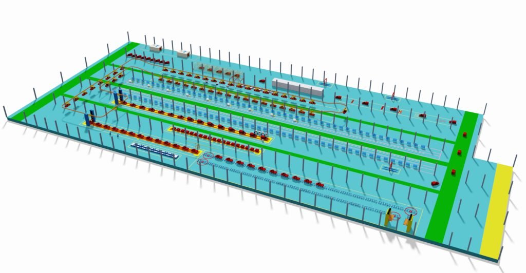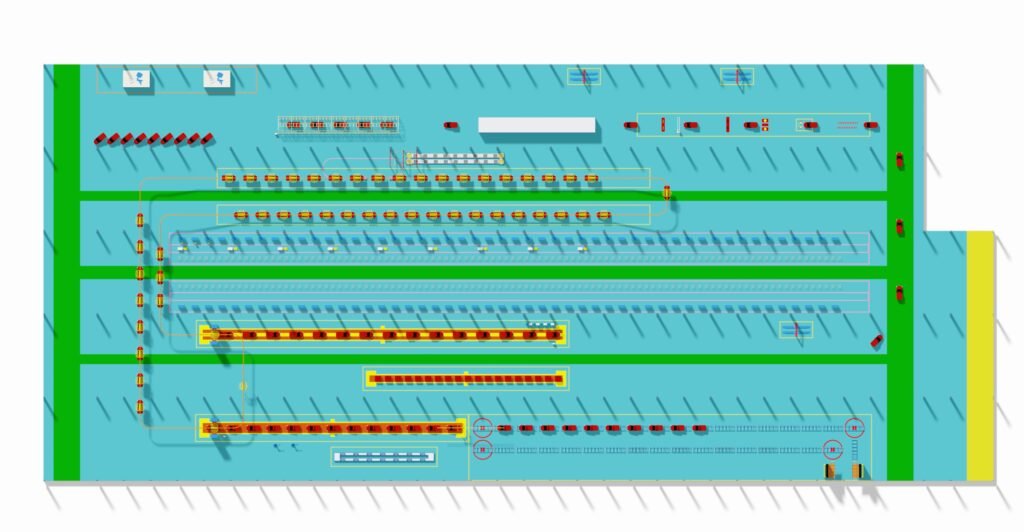 - Line Layout: Use CAD/3D software for detailed plant layout design, planning the material flow and spatial relationships between the main lines (Interior, Chassis, Final), sub-assembly lines (Doors, Cockpit, Engine Front Axle), and test lines (Wheel Alignment, Headlight Test, Roller Test).