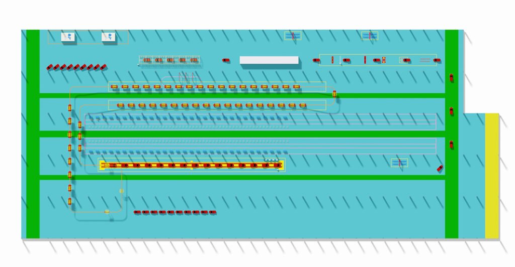 - Flow Line Layout: Materials and vehicle bodies move along precisely calculated paths and speeds, progressing sequentially through all process steps from a sheet of steel to a finished vehicle.