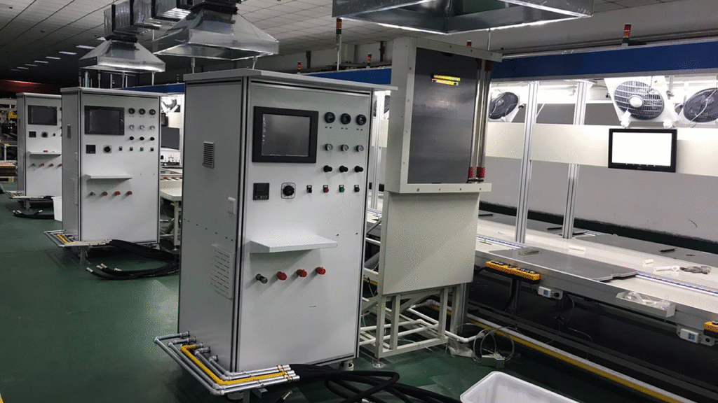 - Electrical Assembly Stations: Install main control board, display, sensors, wiring harness, etc.